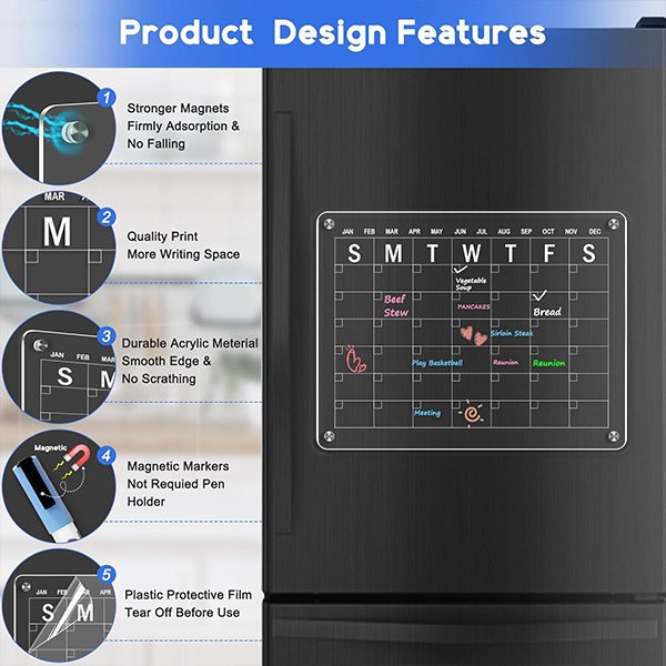 S naším magnetickým kalendárom budete mať prehľad o dôležitých dátumoch a schôdzkach. Je navrhnutý tak, aby sa ľahko prichytil na chladničku alebo na akúkoľvek inú magnetickú plochu.