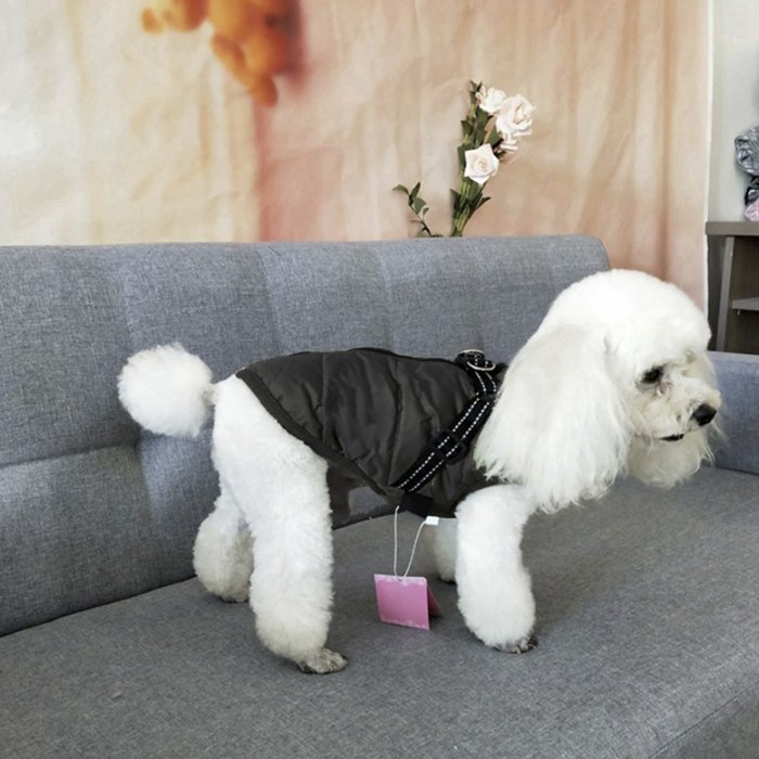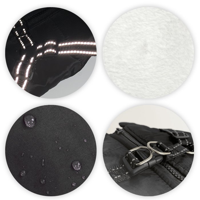 Konštrukcia postroja na zadnej strane je reflexná a nastaviteľná, môžete ho pripojiť k rôznym vodítkam pre psov. Nemusíte kupovať samostatne kabáty a podbradníky, pretože náš psí kabát poskytuje oboje. Napriek dobre zakrytej srsti nebude psom prekážať, keď si budú chcieť uľaviť a vykonať potrebu.