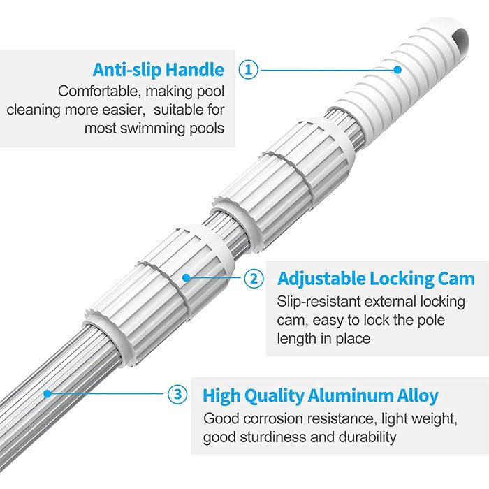 Táto tyč na čistenie bazénov je vyrobená z vysokokvalitných materiálov, je pevná, odolná a určená na náročné čistiace práce. Jej pohodlné držanie uľahčuje manévrovanie a ovládanie čističa bazénov, zatiaľ čo jej ľahká konštrukcia zaručuje jednoduché používanie.