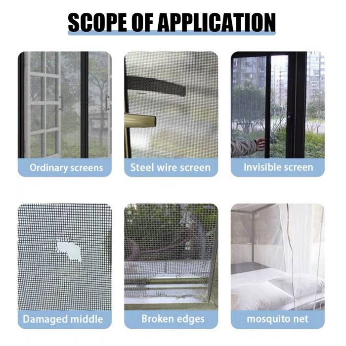 Ideálne pre vnútorné a vonkajšie použitie, ideálne na okamžité zakrytie dier. Naša opravná súprava je vhodná aj do prostredia s vysokou vlhkosťou; Opravte diery a trhliny v okenných sieťkach, stanových sieťkach, bazénoch, mrežiach na obytné autá a pod.