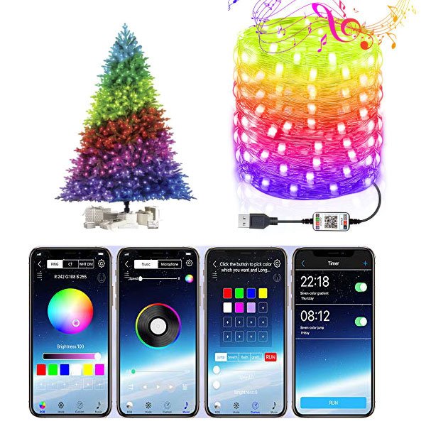 LED vianočné svetlá pre vnútorné stromčeky. Ovládanie cez mobilnú aplikáciu. Rôzne farby, svetelné efekty, hudba, jas a časovač.