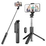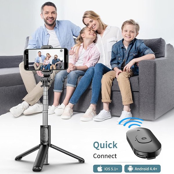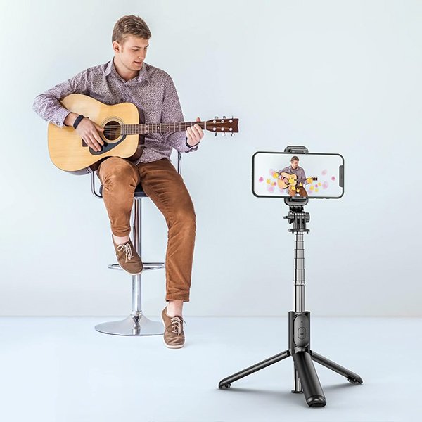Selfie tyčový statív má tiež tlačidlo, ktoré funguje ako diaľkové ovládanie. Môžete ho odobrať zo stojana a ovládať fotografovanie a nahrávanie na diaľku. Stlačením tlačidla na 3 sekundy ho zapnete a spárujete so smartfónom. Bezdrôtový diaľkový ovládač by mal byť pripevnený k rukoväti pre režim selfie tyče alebo odstránený pre diaľkové použitie na statíve. Ovládať ho môžete až do vzdialenosti 10m.