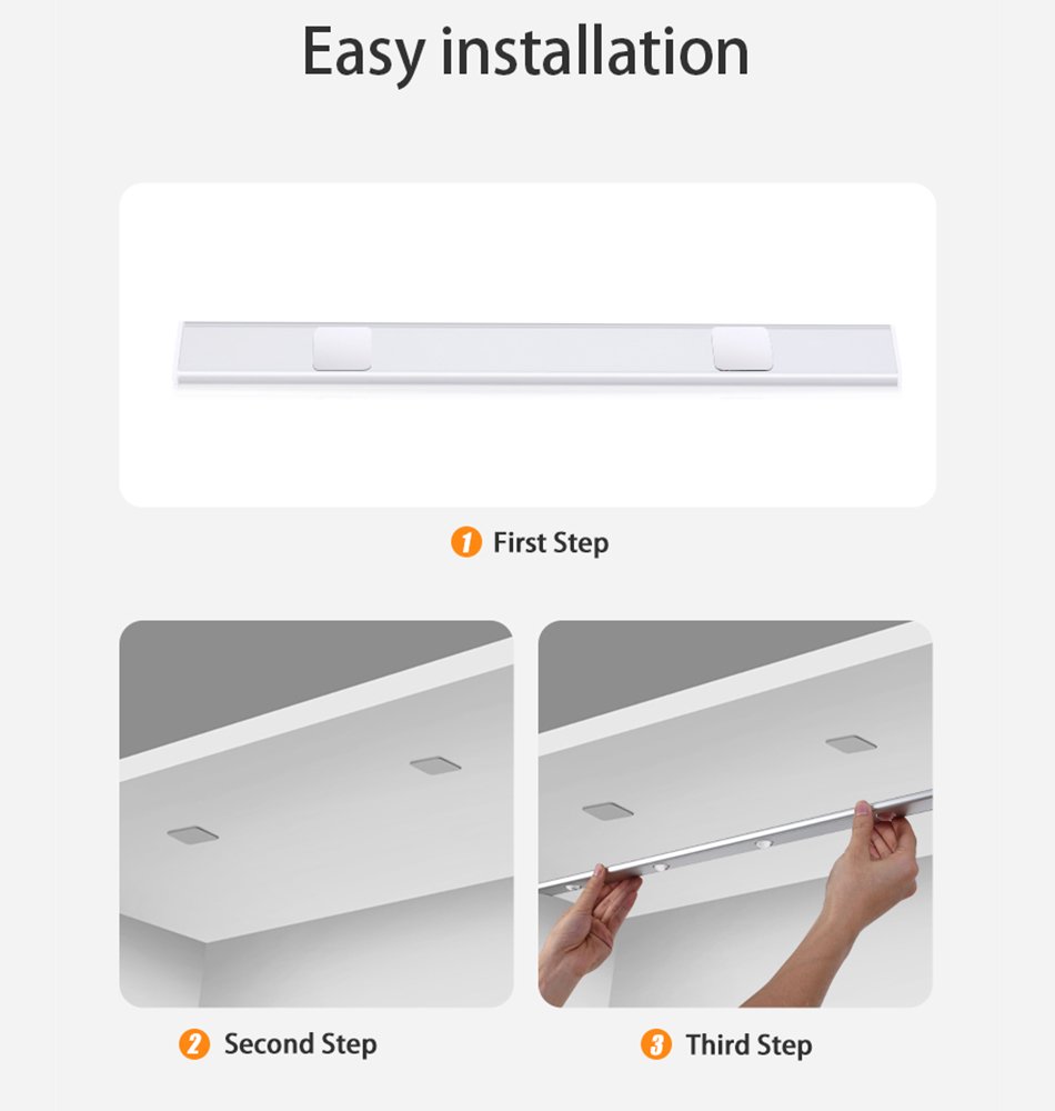 Svietidlo so snímačom je tenké a nenápadné, nech ho pripevníte kamkoľvek. Inštalácia je jednoduchá, pretože nie je potrebné vŕtanie. V balení dostanete dve magnetické železné nálepky, prilepte ich na požadované miesto, odlepte ochrannú pásku a nalepte na ne svietidlo. LED svietidlo tak bude vždy pevne pripevnené.