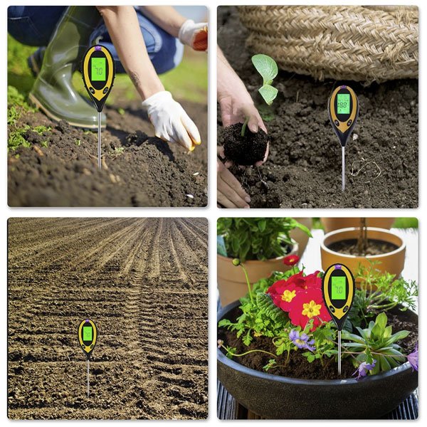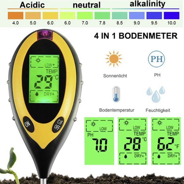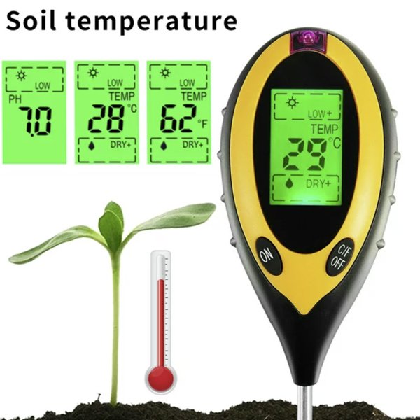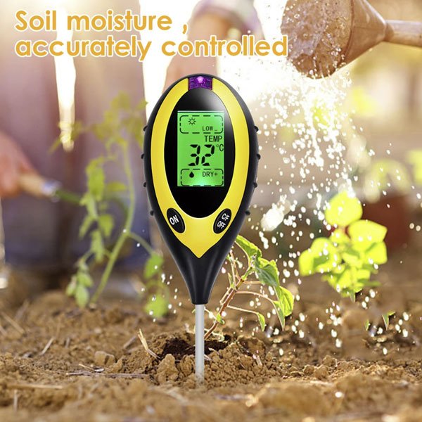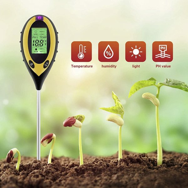 Predstavujeme vám náš pôdomer 4 v 1. Jeho funkcie sú veľmi rôznorodé, dokáže merať vlhkosť pôdy, teplotu, pH pôdy a intenzitu slnečného svetla. Je to najlepší nástroj na monitorovanie zdravia a rastu vašich rastlín.