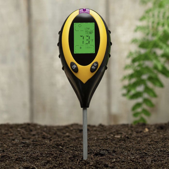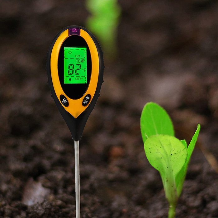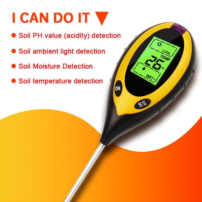 Predstavujeme vám náš pôdomer 4 v 1. Jeho funkcie sú veľmi rôznorodé, dokáže merať vlhkosť pôdy, teplotu, pH pôdy a intenzitu slnečného svetla. Je to najlepší nástroj na monitorovanie zdravia a rastu vašich rastlín.